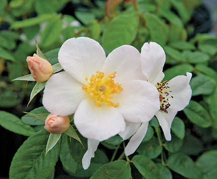 Sally Holmes rose features large, single, creamy-white flowers with a yellow center. The flowers are lightly fragrant and typically produced in clusters creating a stunning display against the dark green foliage.